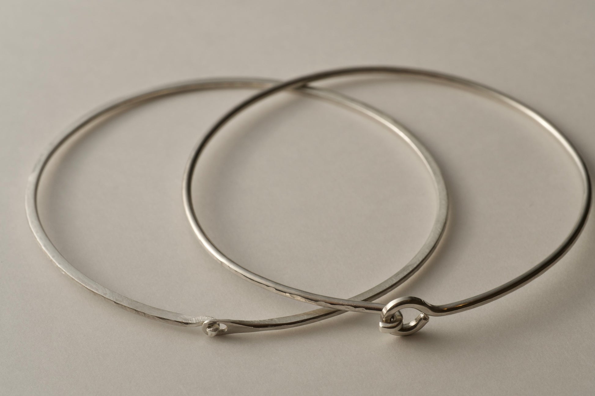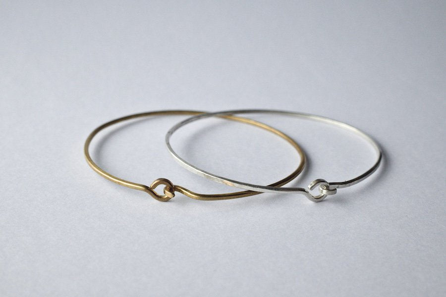 丸みのあるフォルムで、シンプルながらも曲げフックが手首のアクセントになる腕輪です。