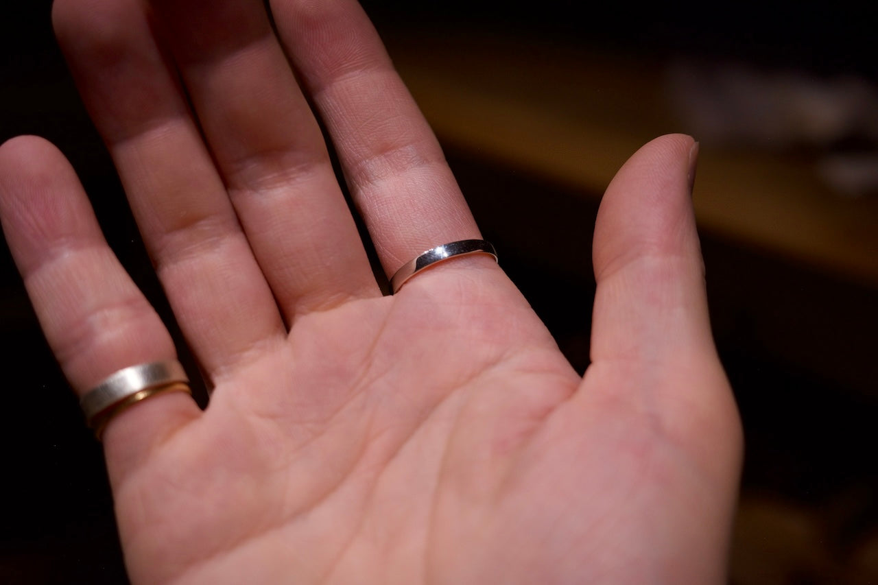 □サイズ選び : 内側の指に接する面が少なく緩さを感じやすいため、リングゲージで測る際はピッタリサイズがおすすめです。