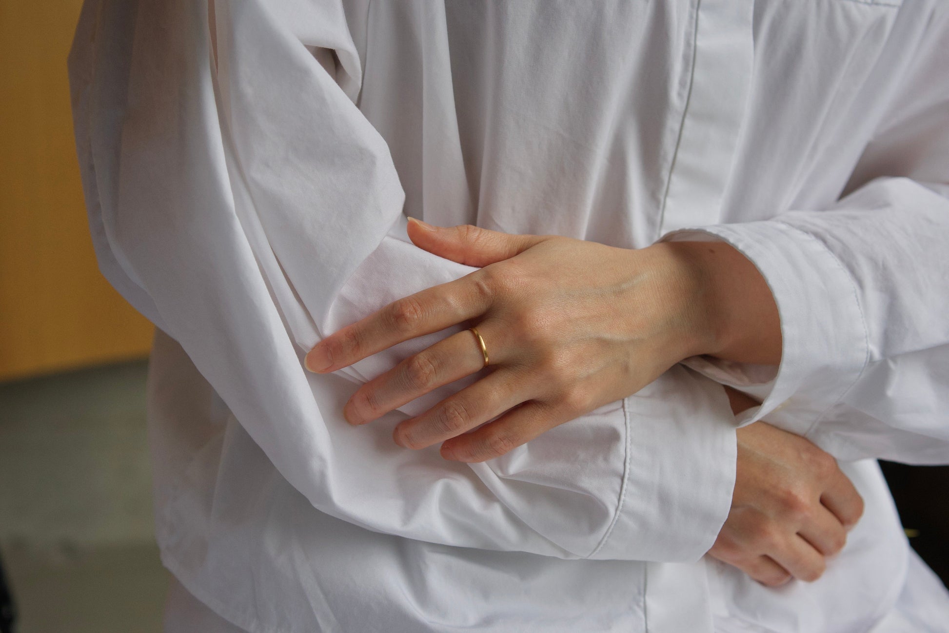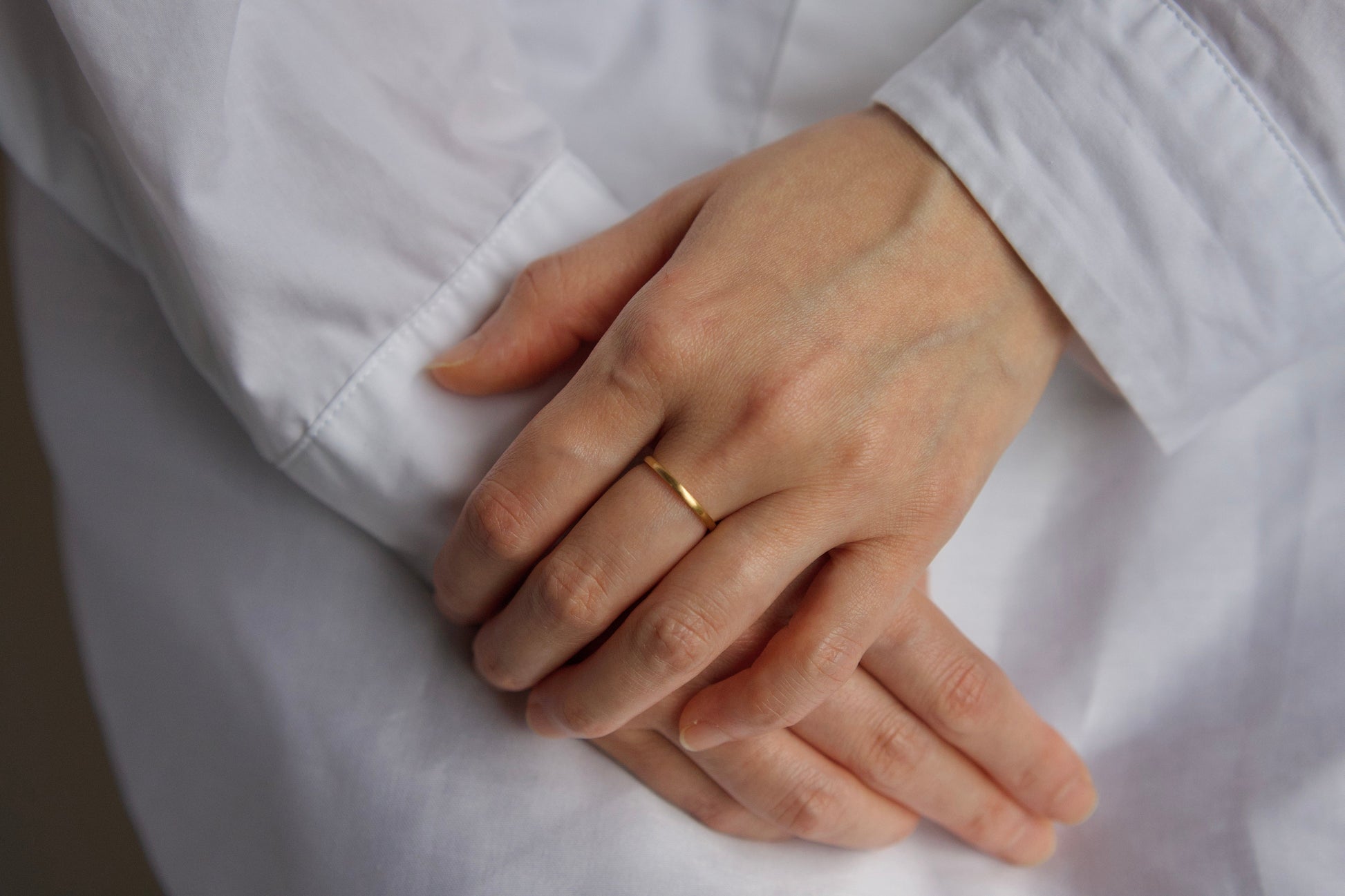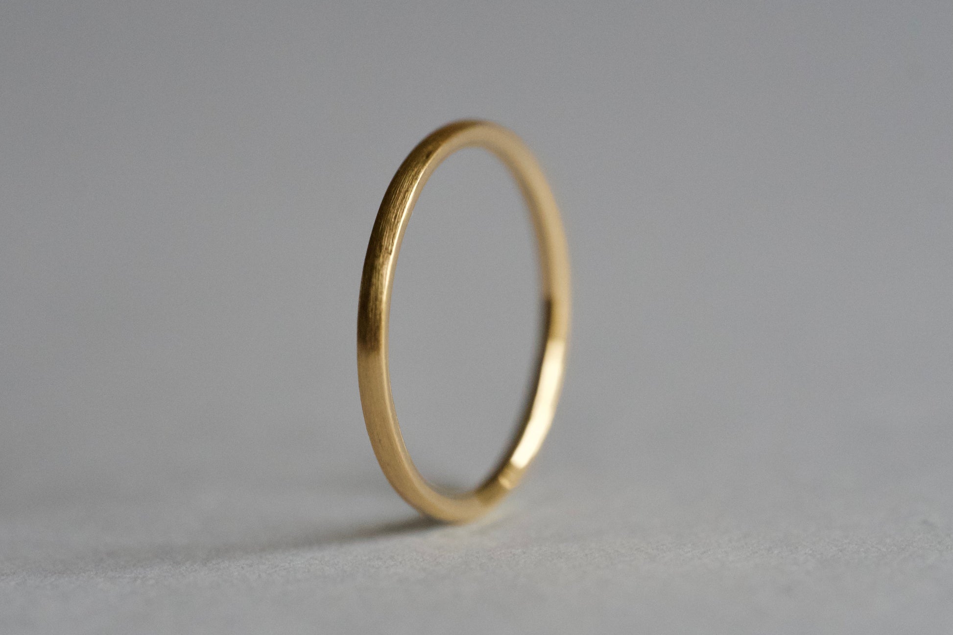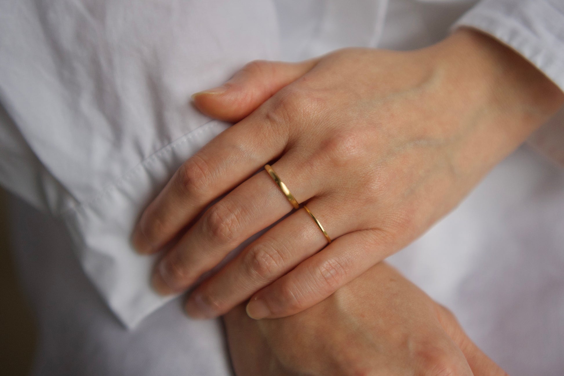 ただの丸線ではなく、叩きと切削によりサイドにエッジラインを作ることで、シンプルながらも着けているときはもちろん、外して置いた時も美しく見える造形に仕上げています。