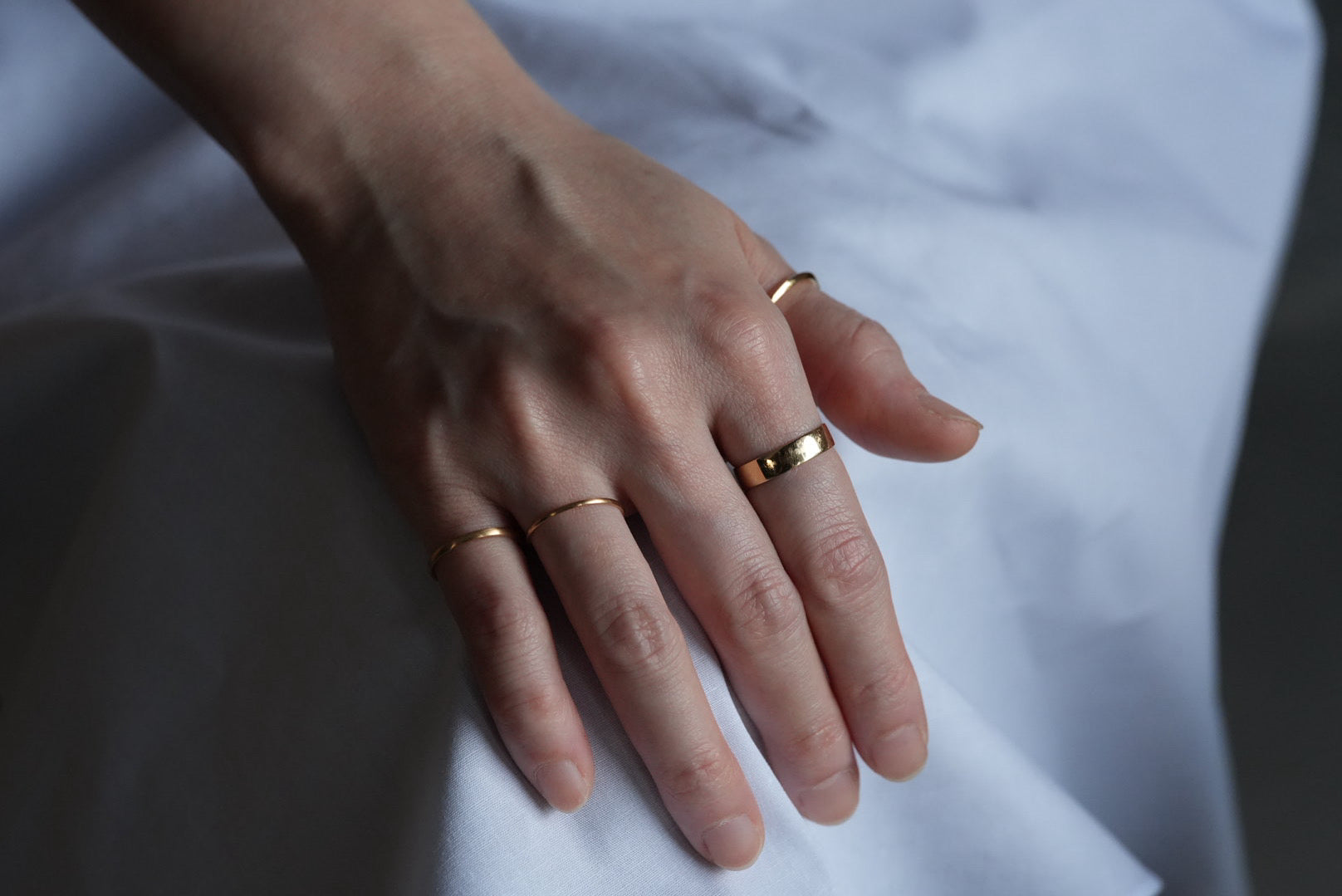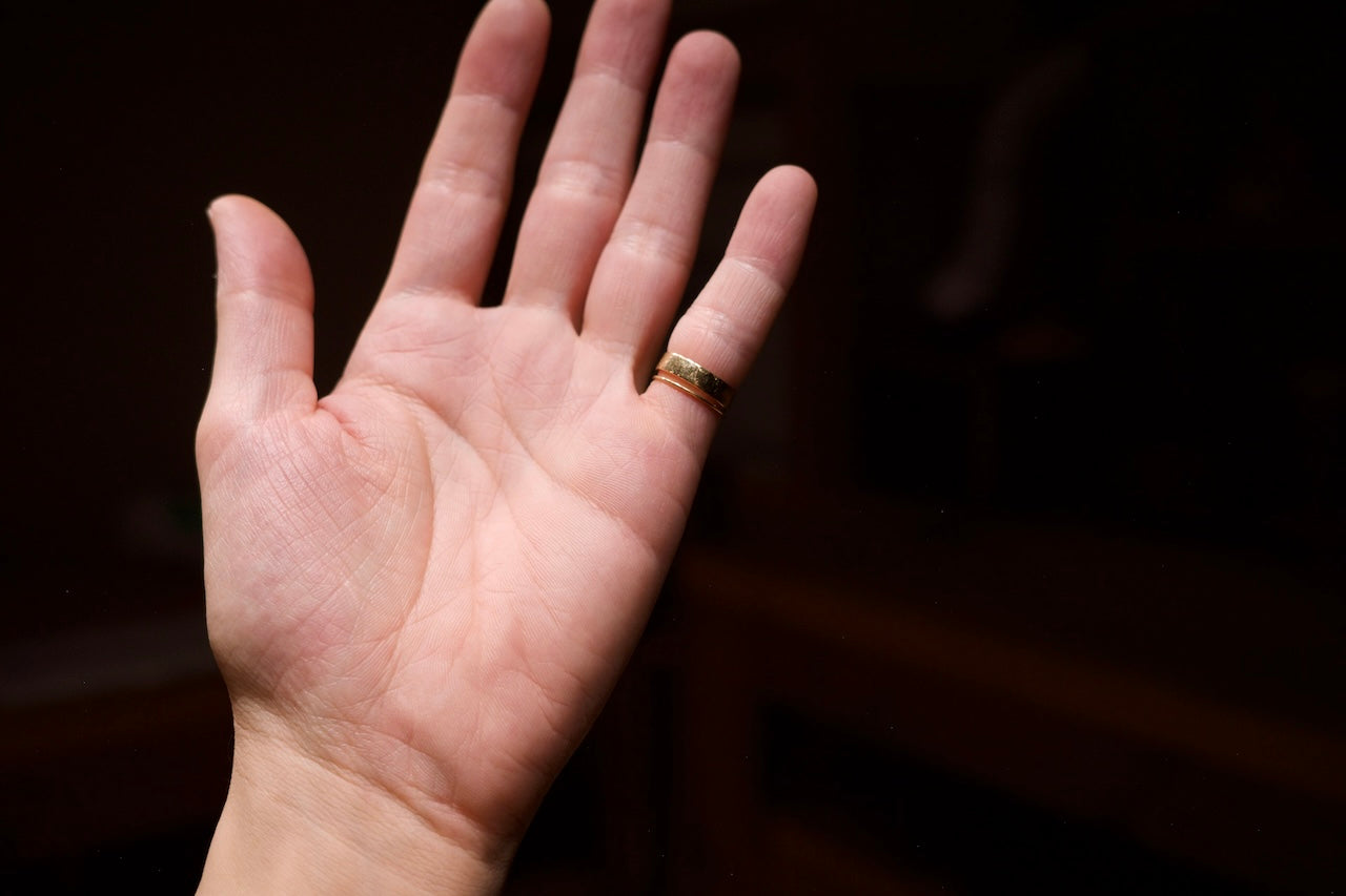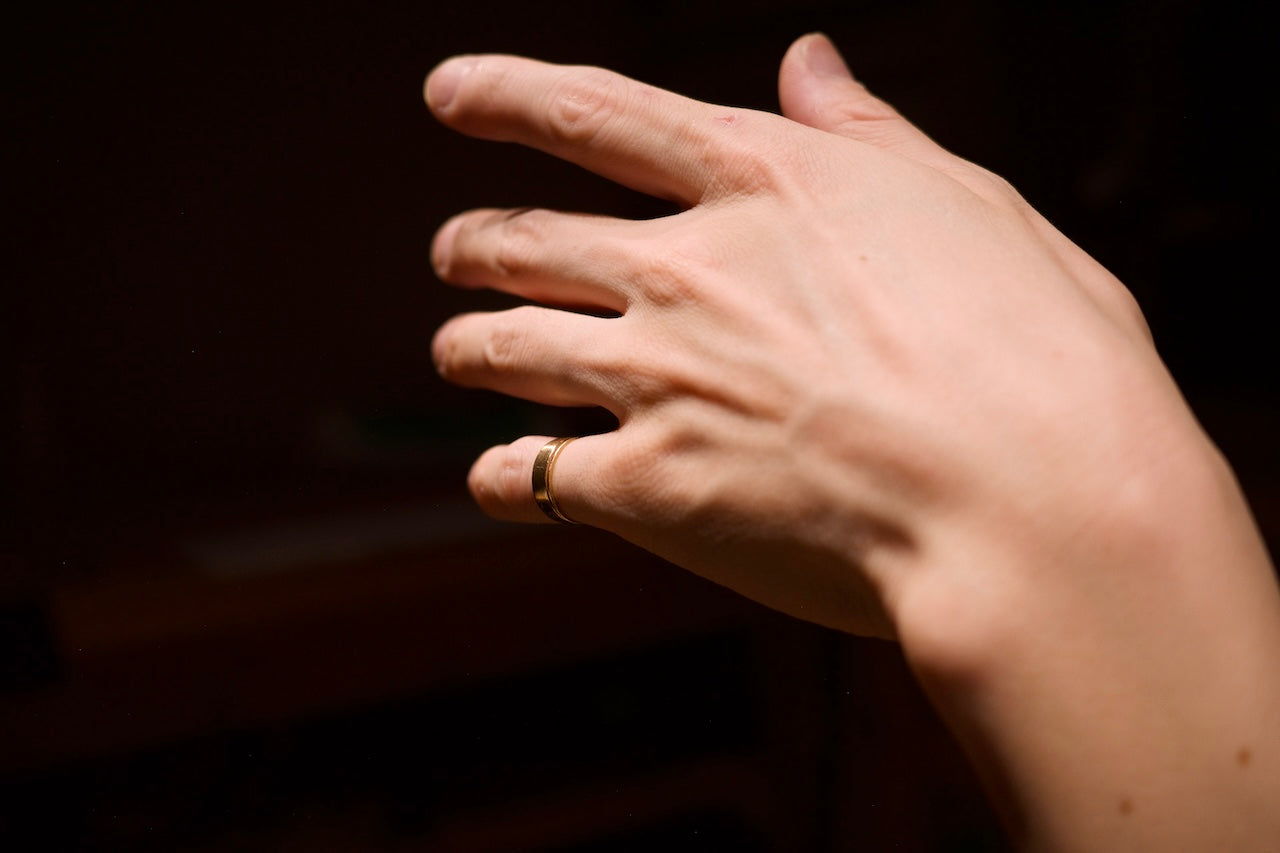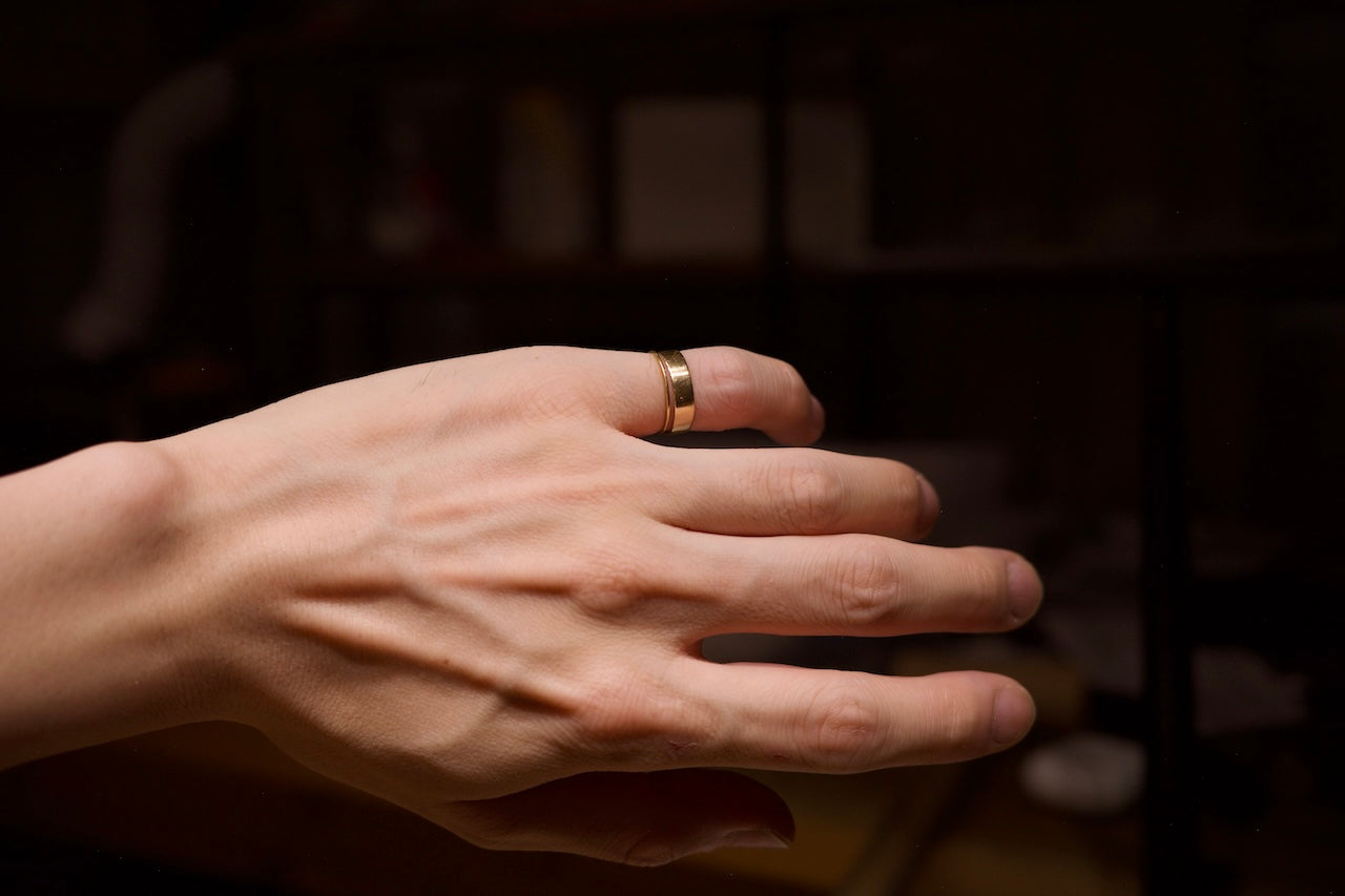 板状のシンプルな形状ですが、内側はゆるりとアールを描いています。幅広で見た目の存在感がありつつも、着けている事を忘れるような指輪に仕上がっています。