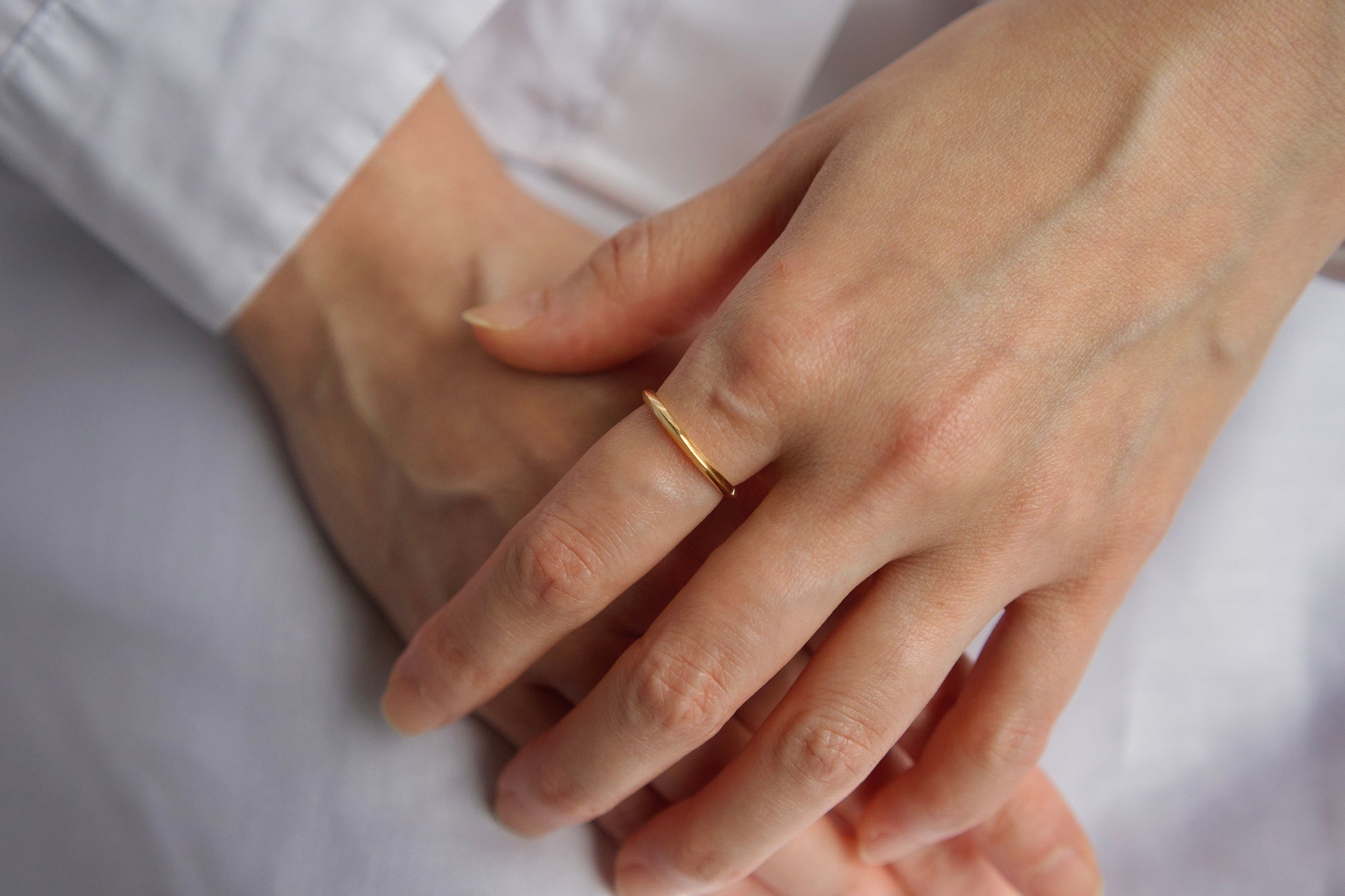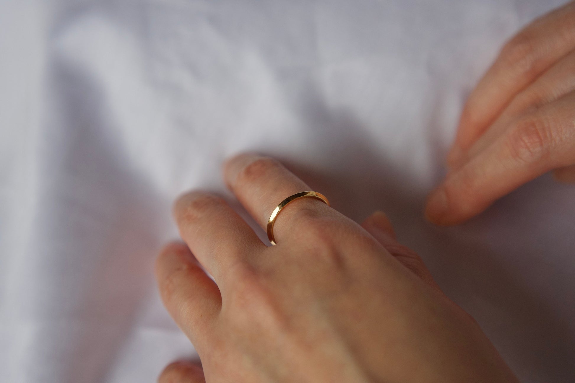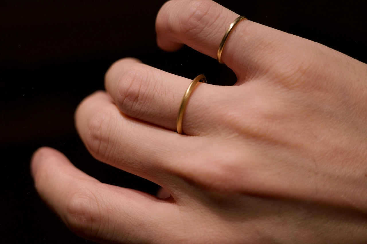 スッキリとした佇まいの角ばった指輪で、着用するとトップのエッジがより際立ち、シャープな線が繊細な印象を与えます。内側は丸みを持たせ、着け心地の良い形状に仕上げています。