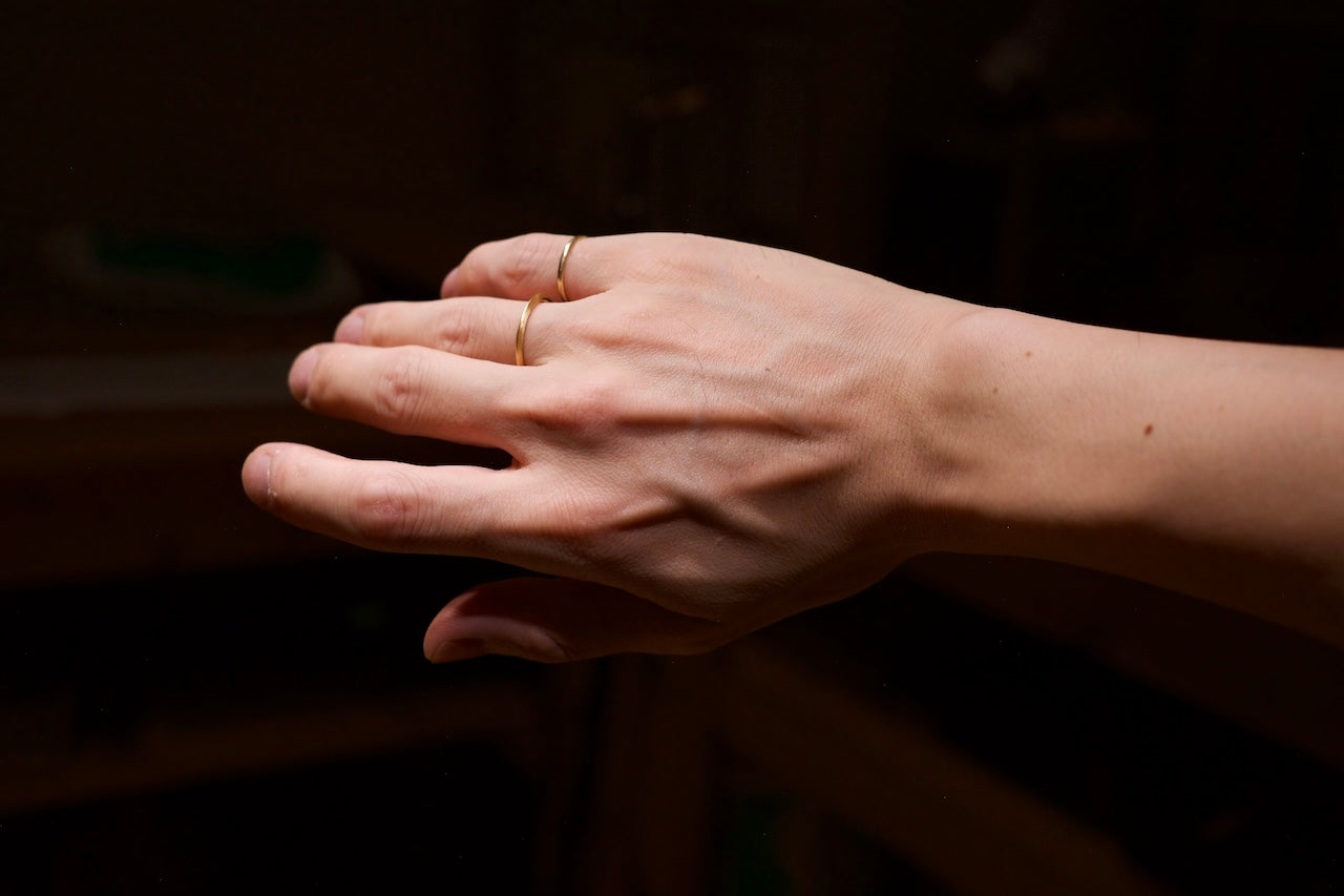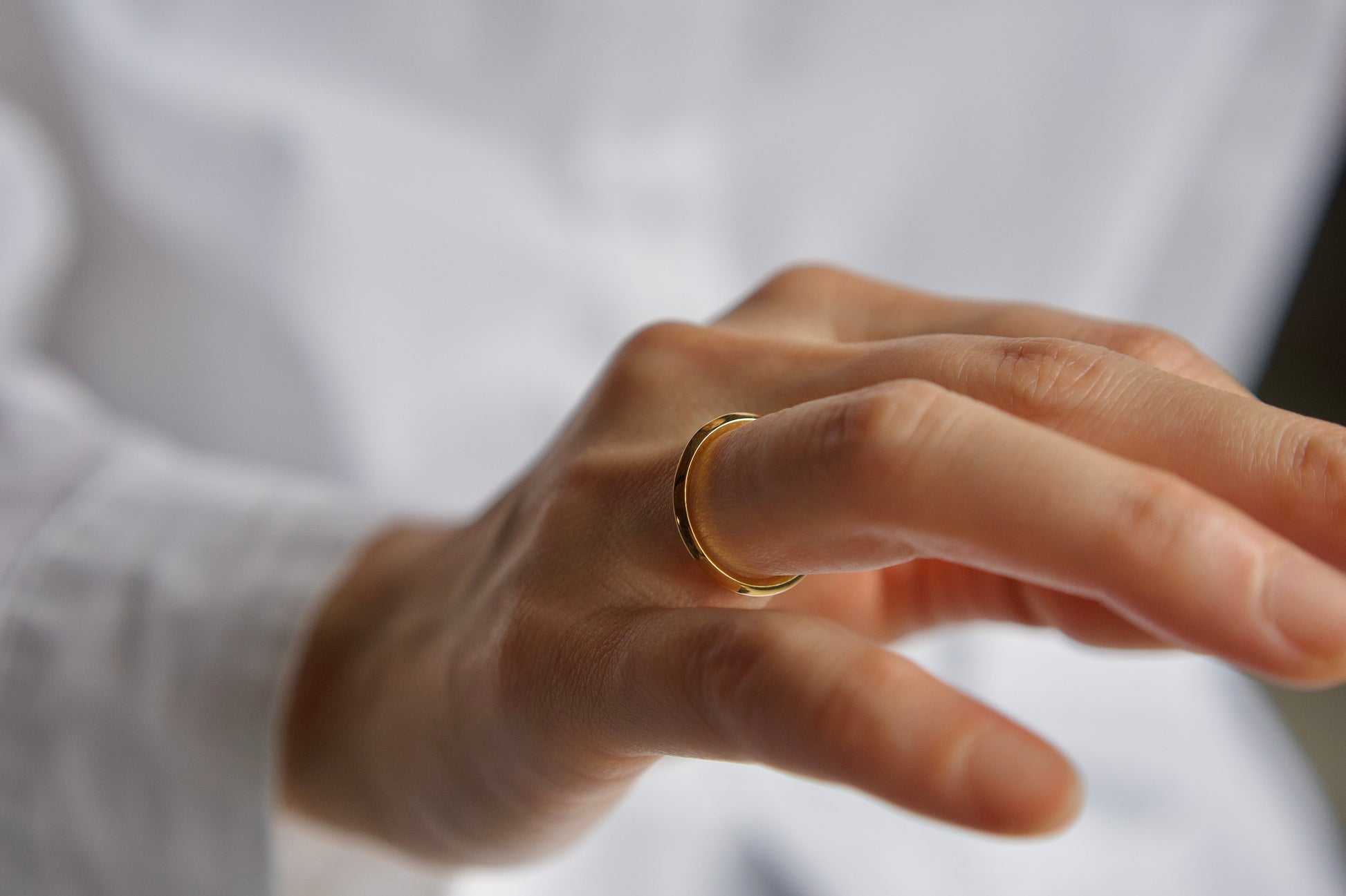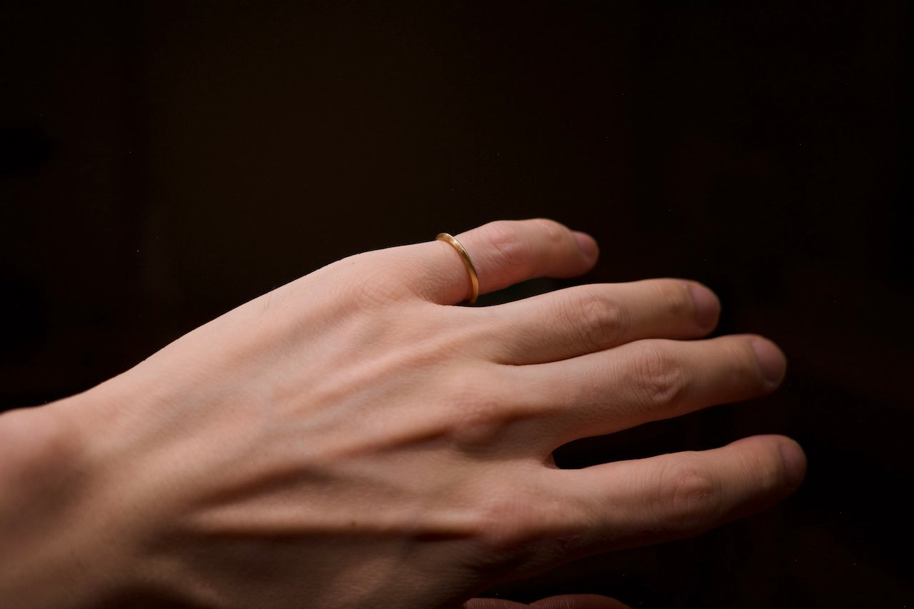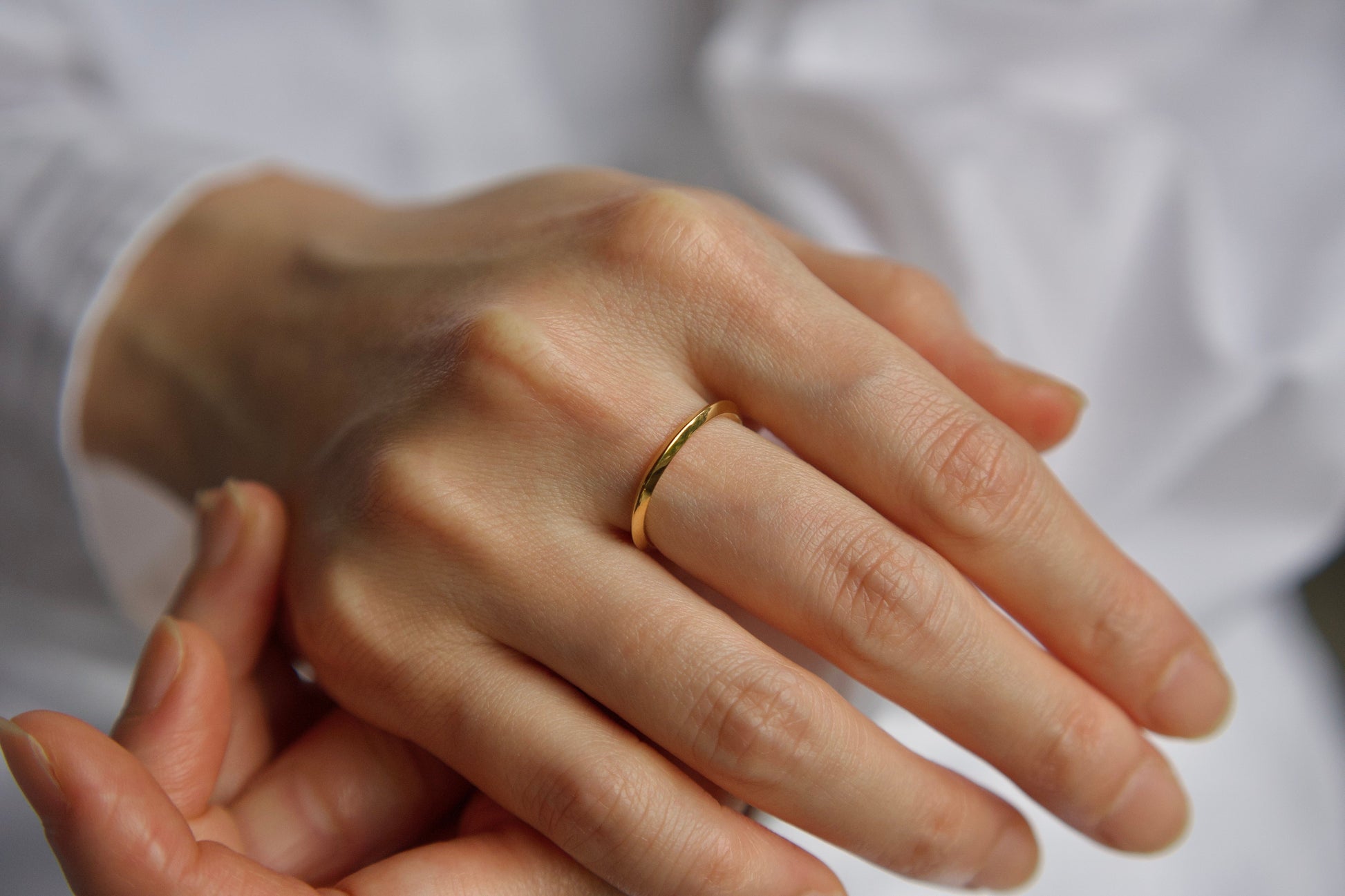 スッキリとした佇まいの角ばった指輪で、着用するとトップのエッジがより際立ち、シャープな線が繊細な印象を与えます。内側は丸みを持たせ、着け心地の良い形状に仕上げています。